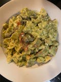 Arborio rice with Italian ground sausage and peas in a pink sauce topped with shaved parmesan cheese.